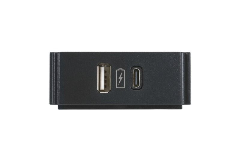 AMX HPX-USBC-US65 modülü, HydraPort® kasasına şarj etme özelliği ile hem USB-C hem de USB-A bağlantısı sağlar. Modül üzerindeki güç sembolü, kullanıcıların gücün sağlandığını tanımlamasını kolaylaştırır. HPX-USBC-US65, USB-C üzerinden 65 W'a ve USB-A üzerinden 30 W'a kadar güç sağlayabilen ABD tarzı A Tipi fişe sahip iki bağlantı noktalı bir güç kaynağı içerir.