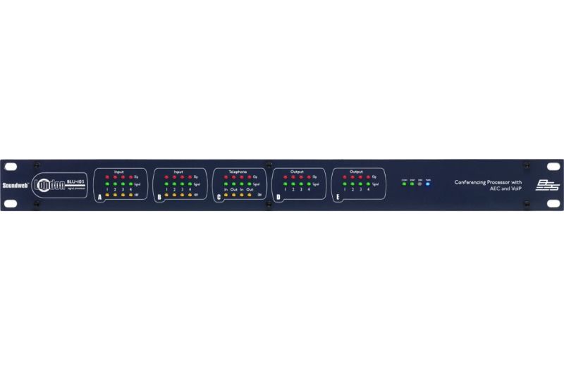 Soundweb London BLU-103, 8 analog giriş ve 8 analog çıkıştan oluşan sabit bir konfigürasyon, IP Üzerinden Ses (VoIP) arayüzü, yapılandırılabilir sinyal işleme, AEC işleme ve yüksek bant genişliği, hataya dayanıklı dijital ses veri yolu sunar.
