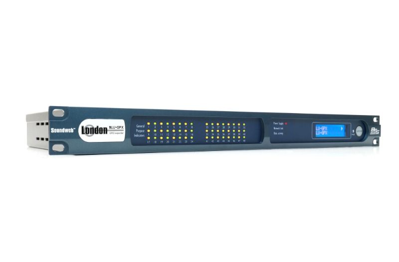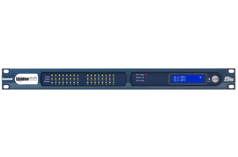 Soundweb London BLU-GPX, ekstra analog kontrol/arabirim yeteneği gerektiren sistemlere Kontrol Girişleri, Mantık Çıkışları ve Rölelerin uygun maliyetli şekilde eklenmesini kolaylaştıran, ağ kontrollü bir GPIO genişleticidir. BLU-GPX, diğer Soundweb London cihazlarında bulunan aynı zengin Mantık Nesneleri paletine, iletişim ve birincil güç için iki PoE-etkin Ethernet bağlantı noktasına, ikincil güç için bir 12VDC güç konektörüne, seri cihazlarla uyumluluk için bir RS-232 bağlantı noktasına, kullanıcı tarafından yapılandırılabilen bir ön panel LED kümesine, kullanıcı tarafından yapılandırılabilen bir ön panel LCD'ye, sesli gösterge için kullanıcı tarafından yapılandırılabilen bir piezo ziline ve konum bulma işlevselliğine sahiptir.