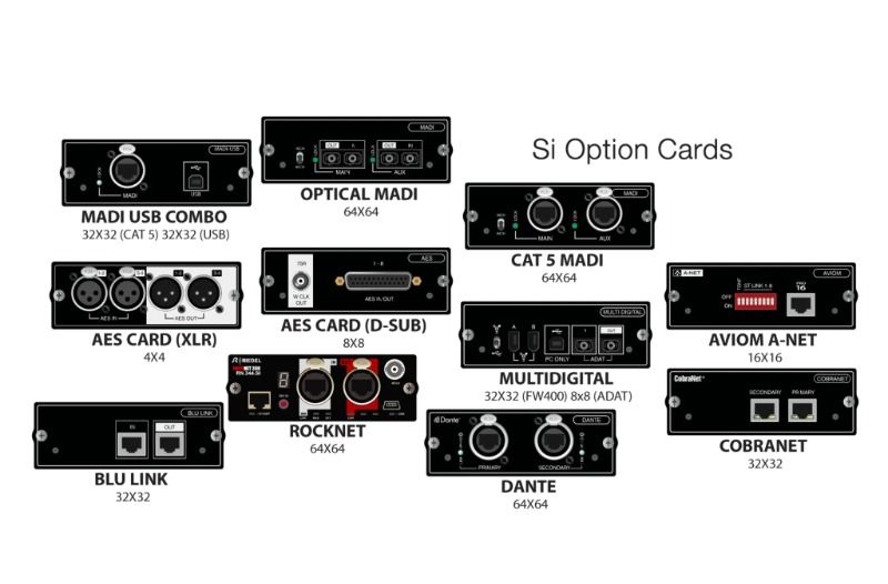 Si dijital konsol serisine seçenek kartları ekleyerek, masanızı çok sayıda analog ve dijital sistemle arayüzleyebilir, aynı zamanda G/Ç sayısını standart konsol yapılandırmasının ötesine genişletebilirsiniz. Seçenek kartlarına ve kartlardan yönlendirme, konsoldaki 'Yama' işlevi aracılığıyla gerçekleştirilir. Daha fazla kart her zaman geliştirilme aşamasındadır ve yeni ortaya çıkan ağlara veya cihazlara arayüz oluşturmak için çeşitli çözümler sağlayacaktır. Takılabilecek seçenek kartlarının sayısı ürün modeline göre aşağıdaki şekilde değişir: