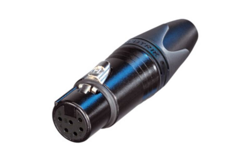 Siyah metal muhafazalı ve altın kontaklı 6 kutuplu dişi kablo konnektörü.