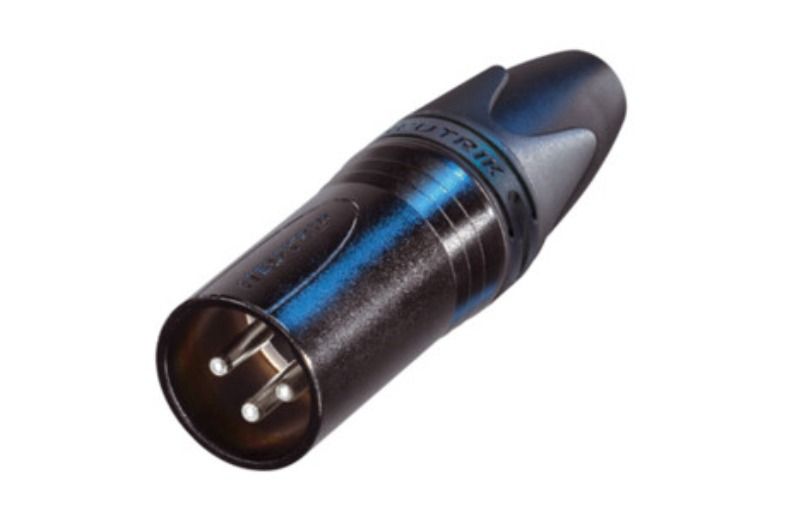 Siyah metal muhafazalı, gümüş kontaklı ve kıvrımlı sonlandırmalı (standart B kıvrımlı) 3 kutuplu erkek kablo konektörü.