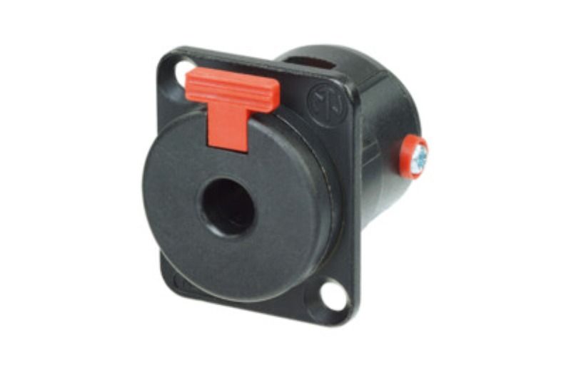 3 kutuplu telefon jakı panel montajlı versiyonu, yanlışlıkla bağlantının kesilebileceği veya şok ve titreşimin meydana gelebileceği durumlarda sağlam ve güvenli bağlantılar sağlar. Standart A-gauge mono veya stereo fişlerle mandallanır. Çiftleşme sırasında fiş otomatik olarak kilitlenir ve kilidi yalnızca kırmızı serbest bırakma tırnağına basılarak açılır. Standart D boyutunda ön panel görünümü.
