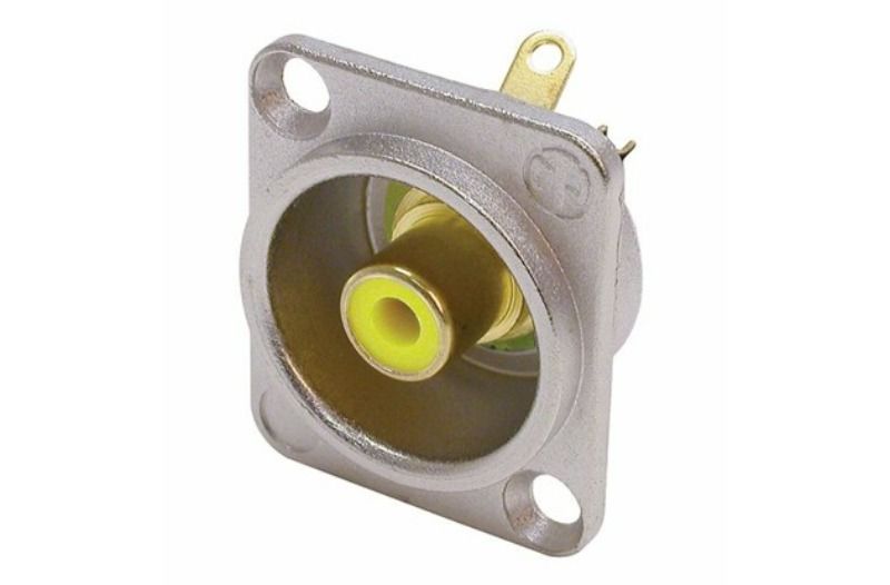Nikel D-şekilli muhafazada fono soketi, sarı izolasyon rondelaları, lehim versiyonu.