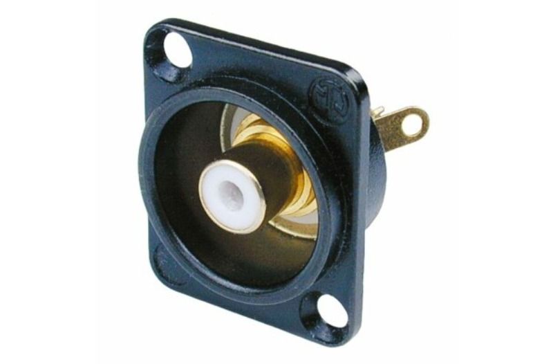 Siyah krom D-şekilli muhafazada fono soketi, beyaz izolasyon rondelaları, lehim versiyonu.
