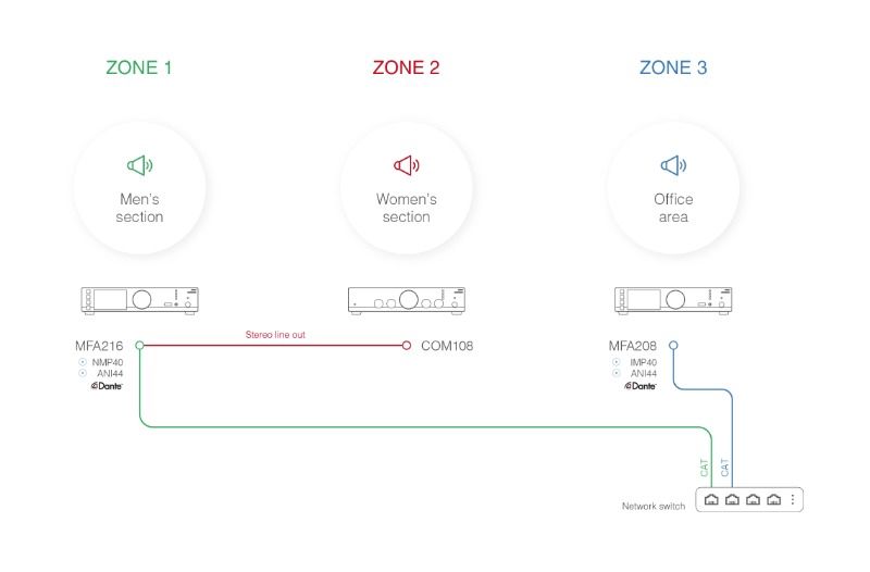 - Dante/AES67 aracılığıyla öncelikli mesajları oynatırken sıfıra yakın gecikme (100 ms)
