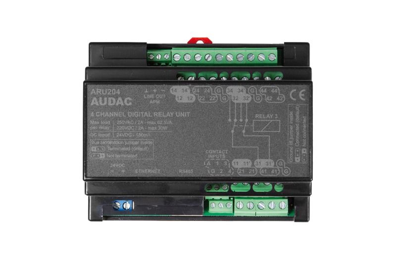 - ARU204, esneklik ve işlevsellik göz önünde bulundurularak özel olarak tasarlanmıştır. 4 röleyi değiştirmenin çeşitli yolları sağlanmıştır; bunlar arasında entegre web arayüzü, isteğe bağlı çağrı konsolları ve ARU204 AUDAC'ın en akıllı ve en yenilikçi röle modüllerini oluşturan analog kontak tetikleme yer alır.