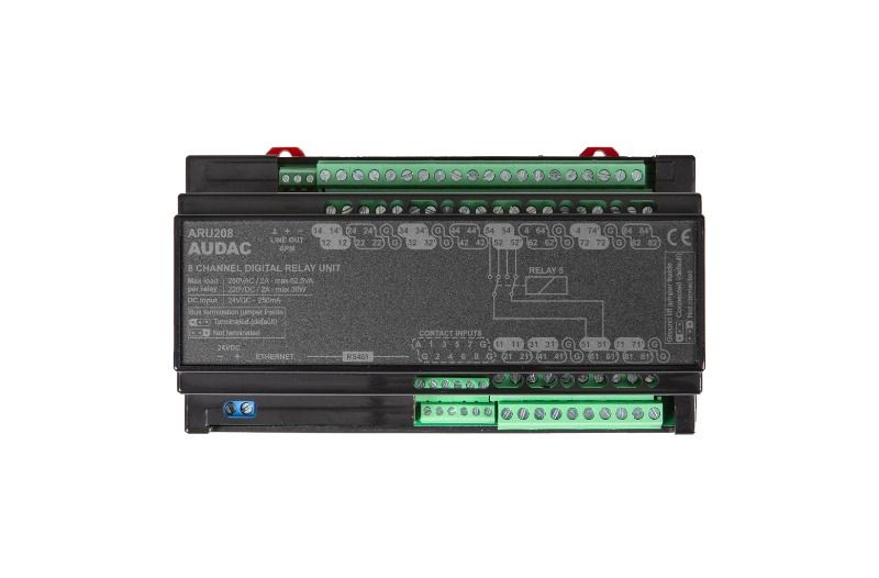 - ARU208, esneklik ve işlevsellik göz önünde bulundurularak özel olarak tasarlanmıştır. 8 röleyi değiştirmenin çeşitli yolları sağlanmıştır; bunlar arasında entegre web arayüzü, isteğe bağlı çağrı konsolları ve ARU208 AUDAC'ın en akıllı ve en yenilikçi röle modüllerini oluşturan analog kontak tetikleme yer alır.