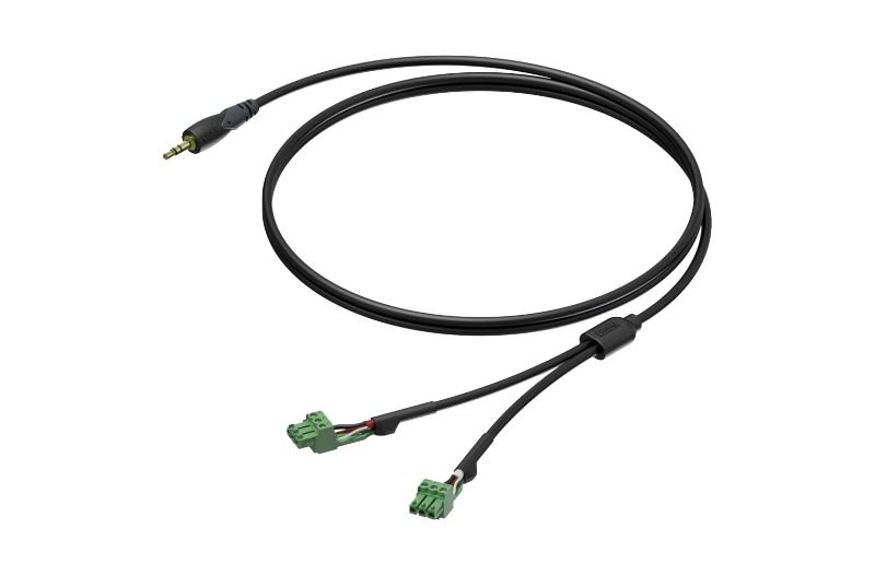 - Bu kablo, terminal blok konnektörleriyle birlikte raf kurulumunu kolaylaştırmak ve karmaşık kurulumları daha hızlı gerçekleştirmek için özel olarak tasarlanmıştır. Kolay takma ve çıkarma için plastik bir kavrama ile donatılmış bu sinyal kablosunda, 2 x Terminal Bloğuna (3,81 mm aralıklı 3 kutuplu Terminal bloğu) 3,5 mm stereo jak bulunur. Bu kablo, 3,5 mm jak konnektörlü taşınabilir cihazlardan gelen hat sinyal seviyesi sinyalini, AUDAC (ve diğerleri) ses markasının matrisleri ve profesyonel amplifikatörleri gibi dengeli terminal bloğu konnektörlerine sahip profesyonel cihazlara bağlamak için kullanılabilir.