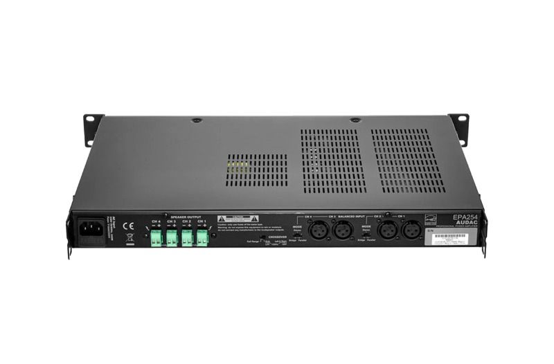- Bu enerji tasarruflu stereo amplifikatör, hiçbir ses sinyali algılanmadığında otomatik olarak bekleme moduna geçecektir (bekleme modunda 1 Watt'tan az güç tüketimi). Ağırlıkları ve kompakt boyutları, bu tek raf alanlı amplifikatörleri hem sabit hem de mobil kurulumlar için ideal kılar. D Sınıfı teknolojiyi kullanmaları, mükemmel verimliliğin yanı sıra olağanüstü ses kalitesi de sağlar. Tamamen pasif olarak soğutulan yapı sayesinde, maksimum güvenilirlik sağlarken yalnızca minimum düzeyde bakım gerekir. Dört kanallı yapı, iki bağımsız stereo kullanma olanağı sunan dört kanaldan oluşur. Entegre aktif geçiş ağıyla birlikte bas kabinli kompakt stereo uygulamaları için eksiksiz bir çözüm sunar. Çeşitli özel işlevler ve gelişmiş devre sistemi, DC arızasına, kısa devreye, aşırı ısınmaya ve aşırı yüke karşı optimum korumayı garanti eder. Sinyal giriş bağlantıları dengeli XLR konnektörleriyle entegre edilmiştir. Çıkışlar terminal blok konnektörleri kullanılarak bağlanır.