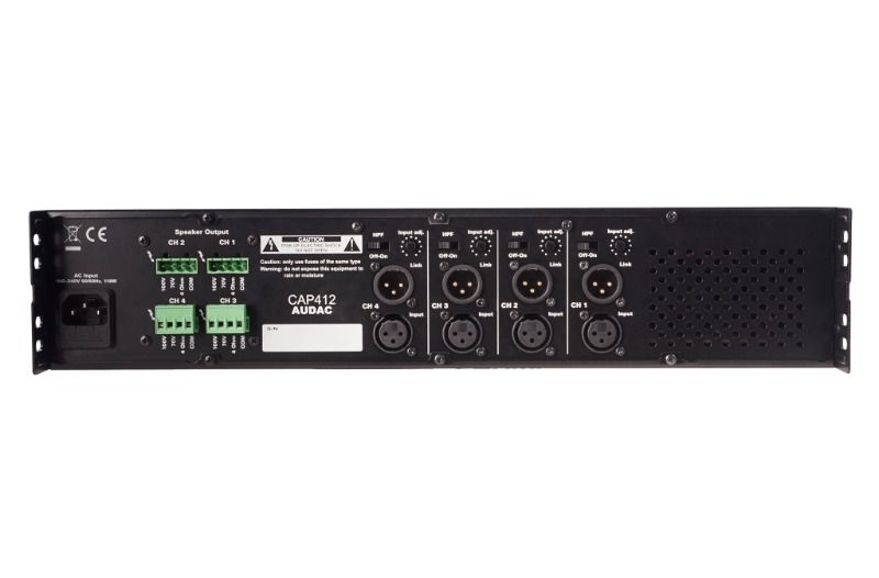 - CAP412, dört ayrı çıkış kanalının her birine 120 Watt sağlama kapasitesine sahip profesyonel bir dört kanallı 100V güç amplifikatörüdür. Bu, kurulu çok bölgeli ses dağıtım sistemleri için büyük bir esneklik ve yeni olanaklar yaratır. Yalnızca gerekli kontrollere ve bağlantılara sahip, kullanım ve kurulumda büyük kolaylık sağlayan, basit bir amplifikatör olarak tasarlanmıştır. Her çıkış kanalı, 100 Volt, 70 Volt ve hatta 4 Ohm düşük empedans uygulamalarında kullanılacak farklı güç bağlantılarını içerir ve giriş sinyali bağlantıları, diğer amplifikatörlere bağlantıya izin veren dengeli XLR konektörleri kullanılarak gerçekleştirilir. İstenilen tüm bağlantı olanaklarının yanı sıra, CAP412 ayrıca ünitenin arkasında bir kazanç kontrol potansiyometresi ve bir yüksek geçişli filtre anahtarı (400Hz) sunar. Yerleşik çok amaçlı koruma devresi, DC arızasına, kısa devreye, aşırı ısınmaya, aşırı yüke karşı koruma sağlar ve gerektiğinde sinyali sınırlar. Bunların hepsi çift raf alanı, çelik 19" muhafaza içine yerleştirilmiştir.