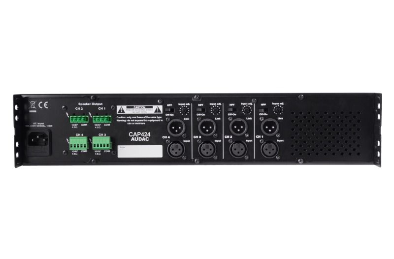 - CAP Serisi, farklı kanallara ve farklı çıkış gücü konfigürasyonuna sahip çeşitli modelleri içeren profesyonel 100V çok kanallı güç amplifikatörleridir. CAP424, 240 Watt çıkış gücüne sahip dört kanallı bir versiyondur. Bu sayede dört bölgeli çok bölgeli ses dağıtım sistemleri için esnek bir çözüm yaratılmış olur. Kullanım ve kurulumda büyük kolaylık sağlayan, yalnızca gerekli kontroller ve bağlantılara sahip, basit amplifikatörler olarak tasarlanmıştır. Cihazların yüksek verimliliği ve güvenilirliği, D Sınıfı amplifikatör teknolojisiyle birlikte anahtarlamalı güç kaynaklarının kullanılmasıyla elde edilir. Sıcaklık kontrollü bir FAN, aşırı vızıltıyı önlerken tüm parçaları sürekli olarak doğru çalışma aralığında tutar. Yerleşik çok amaçlı koruma devresi DC arızasına, Kısa devreye, aşırı ısınmaya, aşırı yüke karşı koruma sağlar ve gerektiğinde sinyali sınırlar. Giriş bağlantıları dengeli XLR konnektörleri kullanılarak gerçekleştirilir ve diğer amplifikatörlere bağlantı için Bağlantı çıkış konnektörleri sağlanır. Ayrıca her kanal için yüksek geçişli filtre anahtarı (400 Hz) ve kazanç ayar potansiyometresi bulunmaktadır. Çıkış bağlantıları güvenilir terminal bloğu konnektörleri kullanılarak gerçekleştirilir ve bunların tümü sağlam yapılı, çift raf alanı (2 HE) 19" raf montaj muhafazasına yerleştirilmiştir.